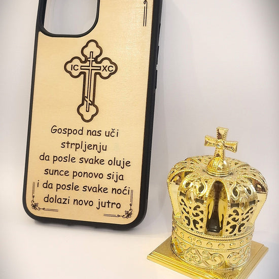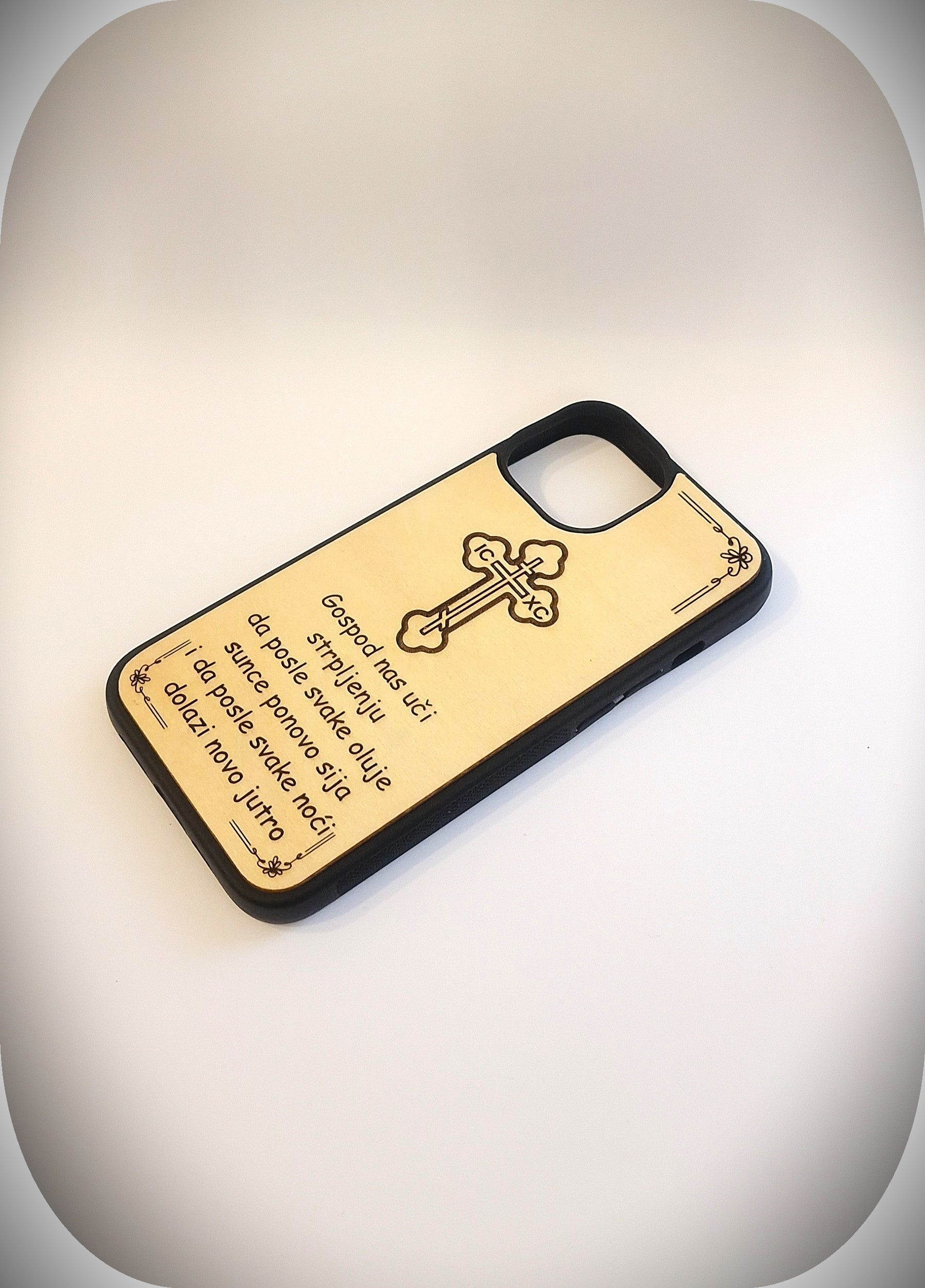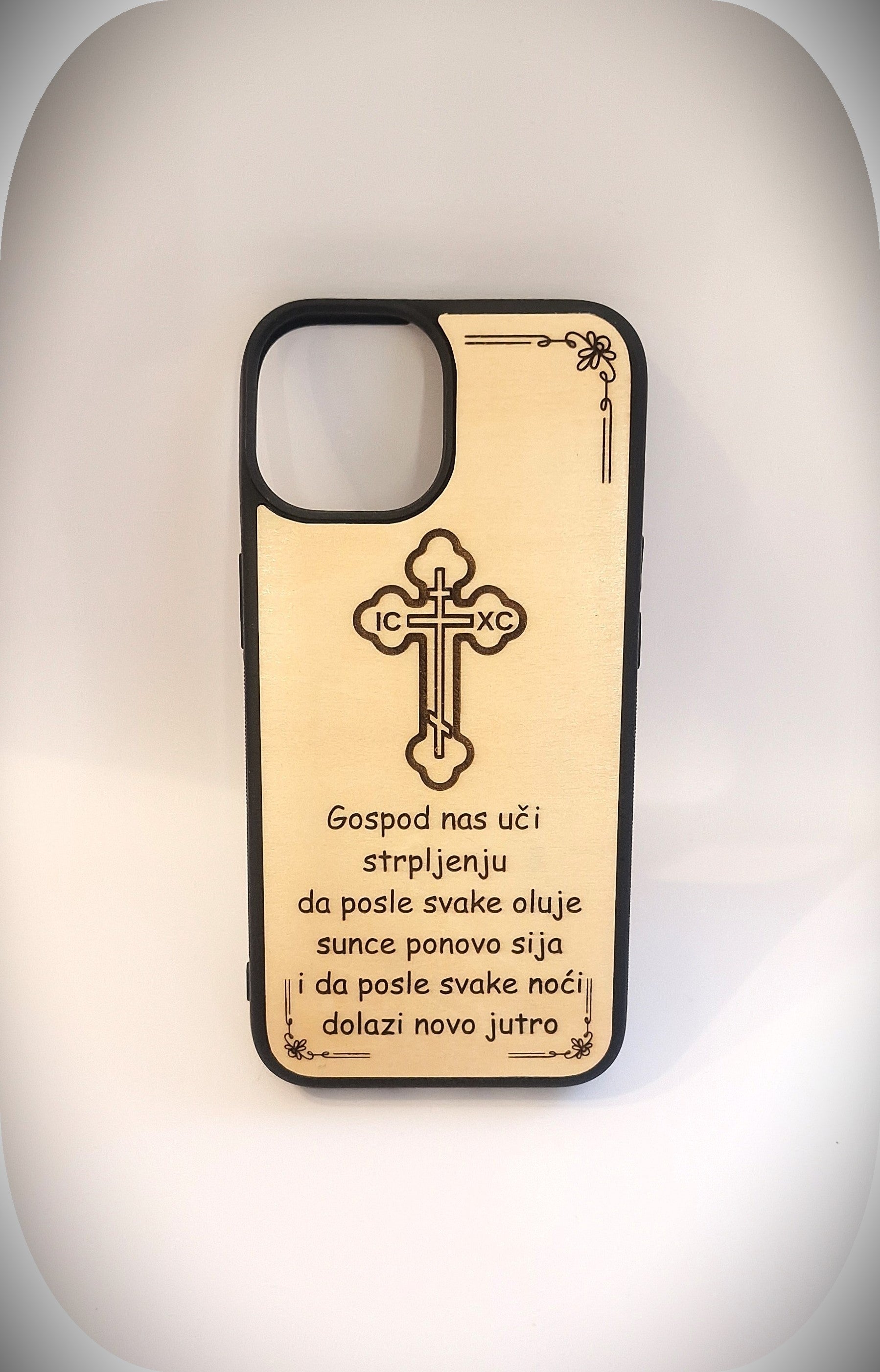 Handyhülle aus Holz mit orthodoxem Kreuz und Gravur